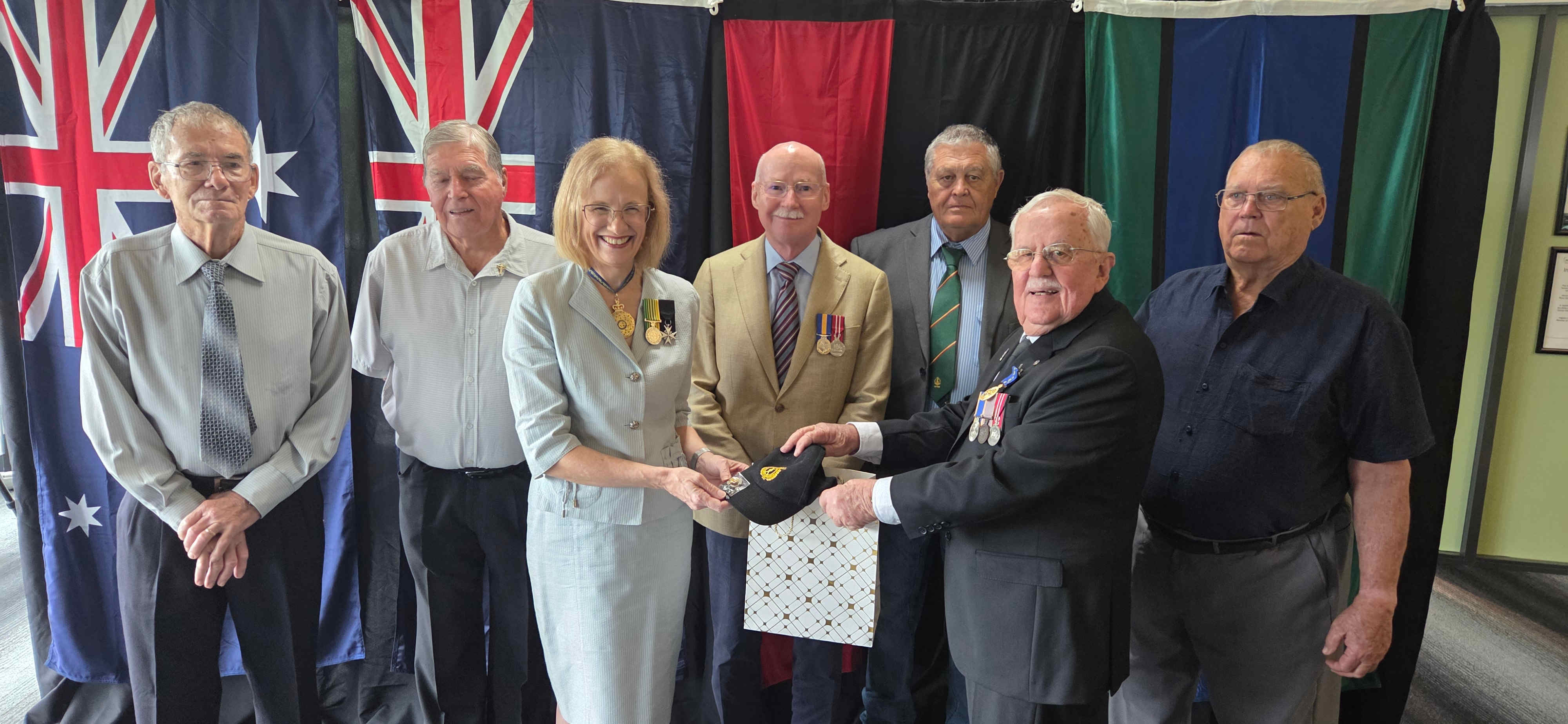 The photo shows the Governor & her Husband, receiving a 31st Bn Assoc Badge & a Cap from Felix, with a group of Ingham Branch Members in the Background.